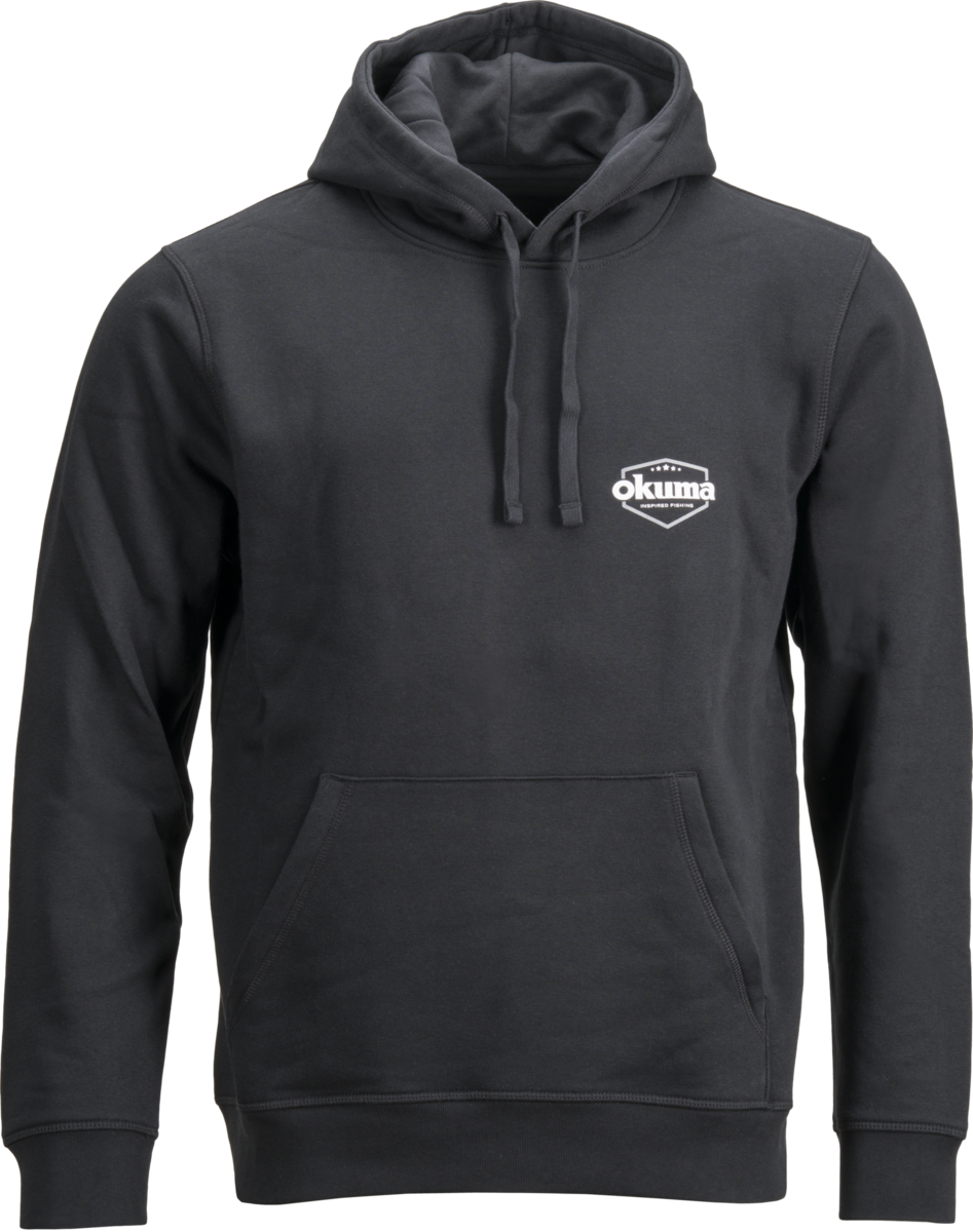 Stylish black hoodie featuring the Okuma “Inspired Fishing” vintage-style logo printed boldly on the back, and a smaller matching logo on the chest. Made from a premium blend of 85% GOTS-certified organic cotton and 15% recycled polyester (280 g/m²) for a soft, warm, and durable feel. Designed with a smaller unisex fit, adjustable hood, and front kangaroo pocket — ideal for everyday comfort or cooler days on the water.